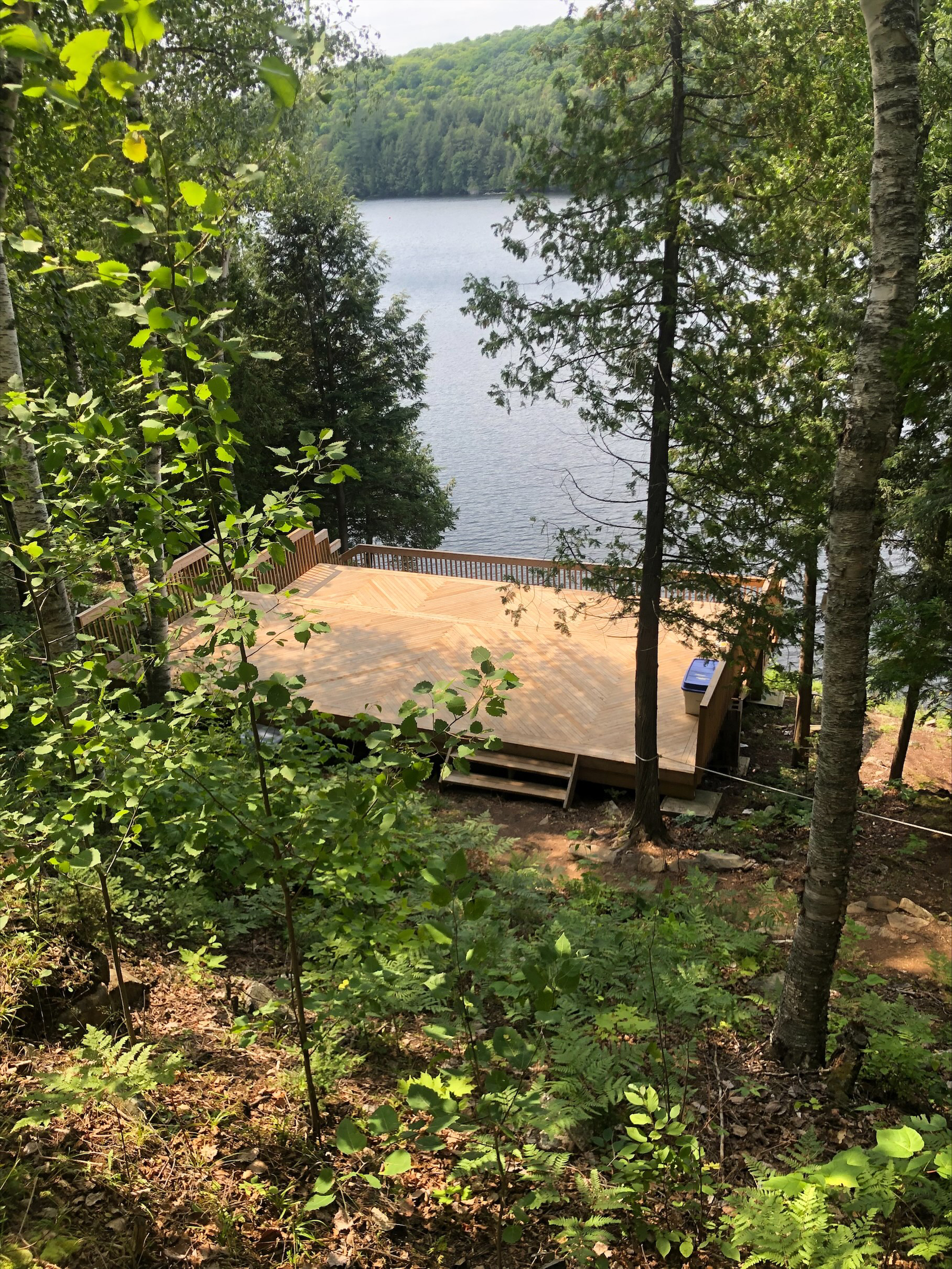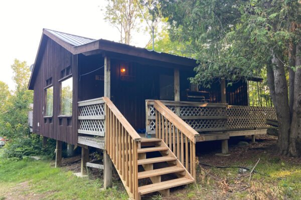 Sleeps up to 4 people. Two bedrooms. 1 Queen and 1 bunk bed. Plus a kitchenette, a small seating area, and private bathroom. The back deck overlooks the lake.
